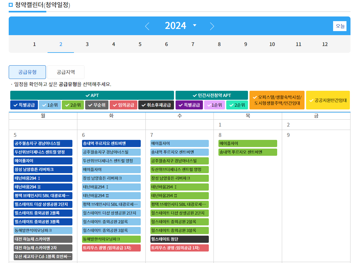 : 청약일정은 모집공고, 청약신청, 청약당첨, 계약, 입주 등의 일정을 달력 형태로 보여줍니다. 청약통계는 청약식청, 청약당첨, 계약, 입주 등의 통계를 지역별, 주택종류별, 공급방식별로 제공합니다.