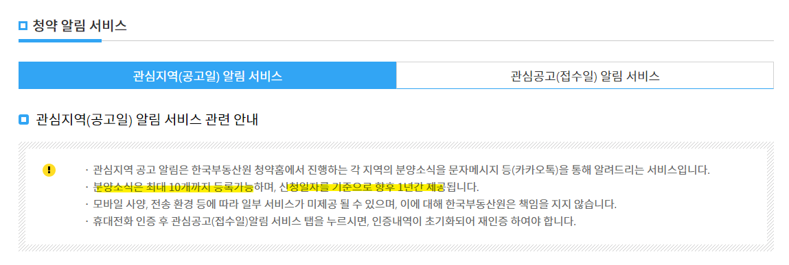 : 관심 있는 지역 최대 10곳의 분양소식을 문자 또는 카카오톡을 통해 알림을 받을 수 있습니다.