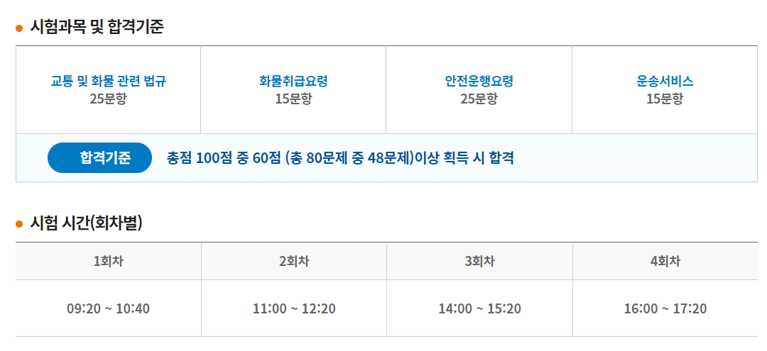 시험과목은 교통 및 화물 관련 법규, 화물 취급 요령, 안전운전 요령, 운송 서비스 4과목이고 총 80문항이 객관식으로 출제됩니다. 이 중 48문항 이상 맞추면 합격입니다. 시험은 매일 총 4회에 걸쳐 진행이 됩니다.