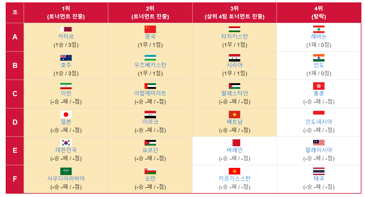 2023 카타르 아시안컵 조편성 결과는 아래 표와 같습니다.