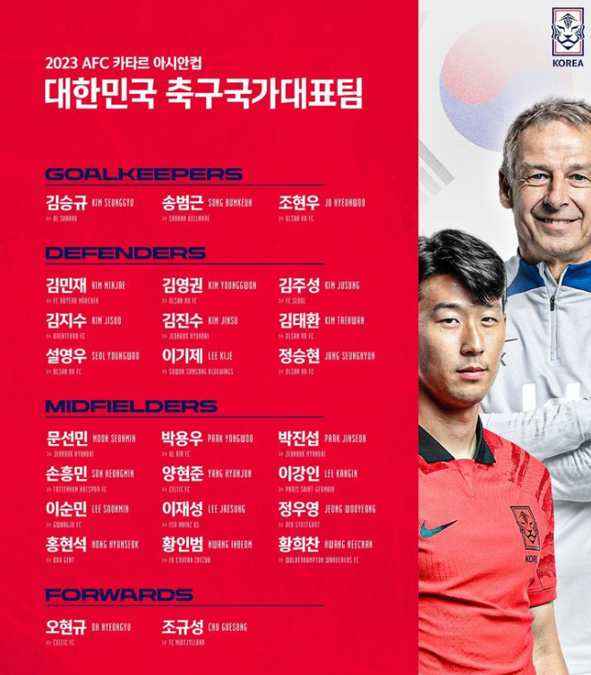 2023 카타르 아시안컵 대표팀 명단 - 출처 : 대한민국축구국가대표팀 인스타그램