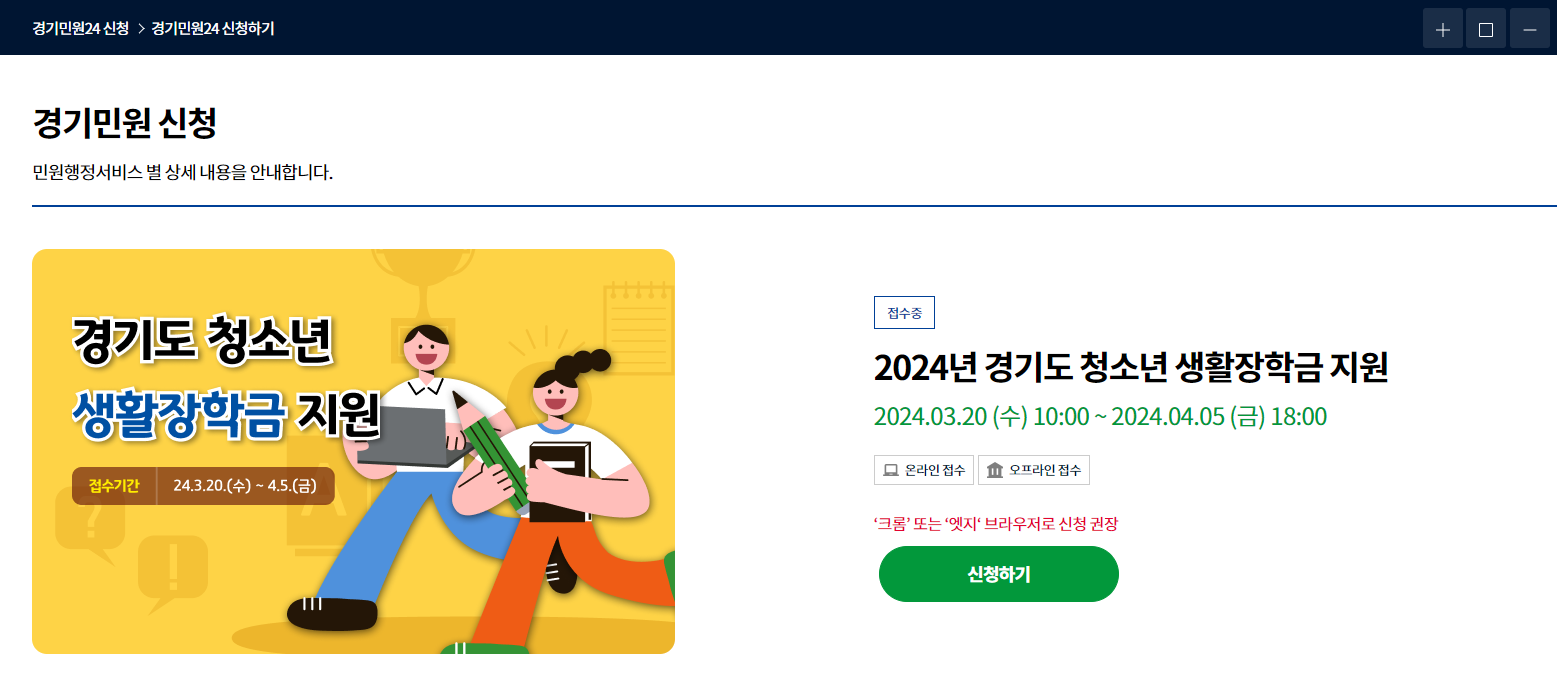 오늘은 포스팅을 통해 2024년 경기도 생활장학금 지원대상, 신청기간, 신청방법, 제출서류, 유의사항 등에 대해 자세히 알려드리도록 하겠습니다.