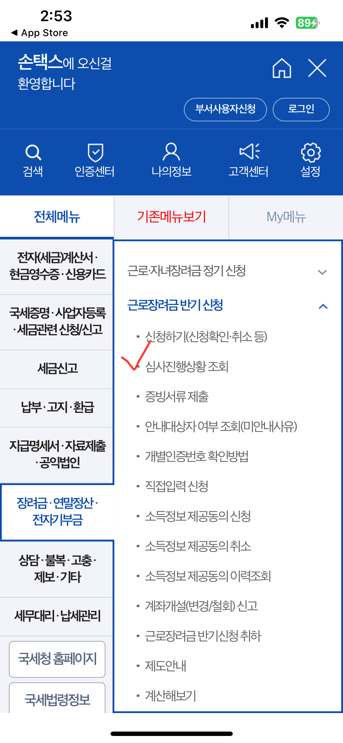 손택스 어플을 다운받은 뒤 실행해주세요. 그다음 우측 상단에 전체메뉴를 클릭하신 뒤 장려금 연말정산 전자기부금 메뉴를 클릭하신 뒤 근로장려금 반기 신청에 들어가서 심사진행조회를 하시면 됩니다.