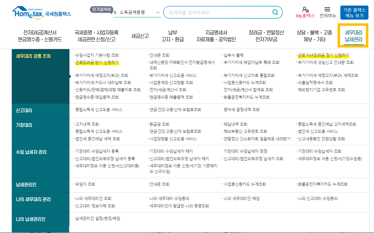 국세청 홈페이지에서 근로장려금 신청, 조회하는 방법도 알려드리겠습니다. 국세청 홈택스 홈페지에 접속하신 뒤 세무대리 납세관리 메뉴에 마우스 커서를 가져다 대시면 근로 자녀장려금 정기신청하기, 근로장려금 반기 신청하기 메뉴가 있습니다.