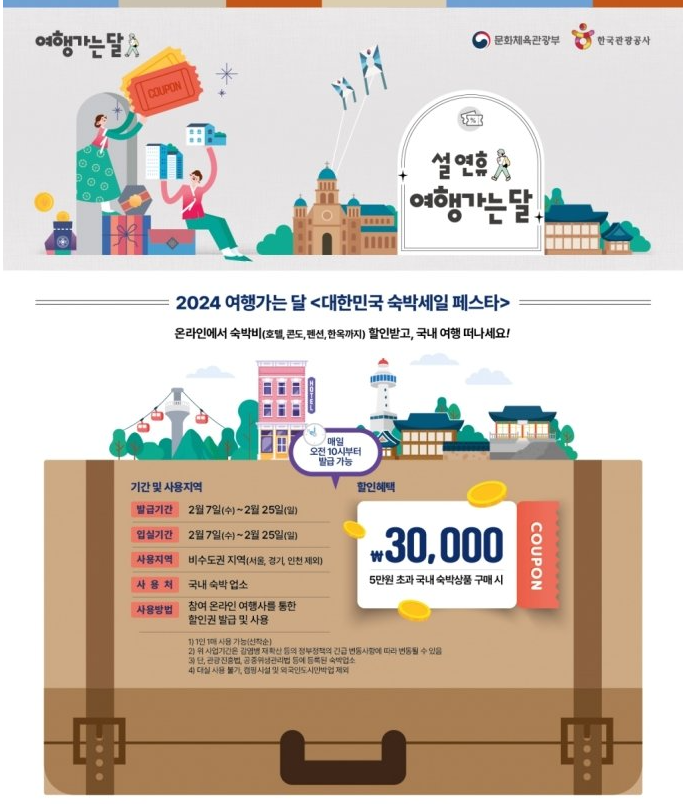 문화체육관광부와 한국관광공사는 7일 부터 국내 숙박 할인 혜택을 제공하는 '설 연휴 여행가는 달과 함께하는 2024 대한민국 숙박세일 페스타'를 시작합니다.