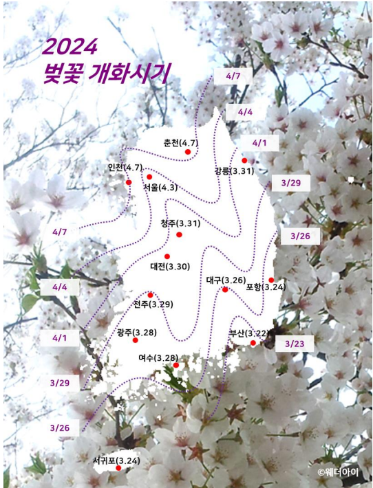 아래는 웨더아이 사이트에서 예상한 2024 벚꽃 개화시기입니다.