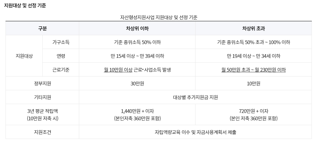 차상위 이하 : 근로소득 장려금 3년간 총 1080만원 지원(매월 30만원 적립)