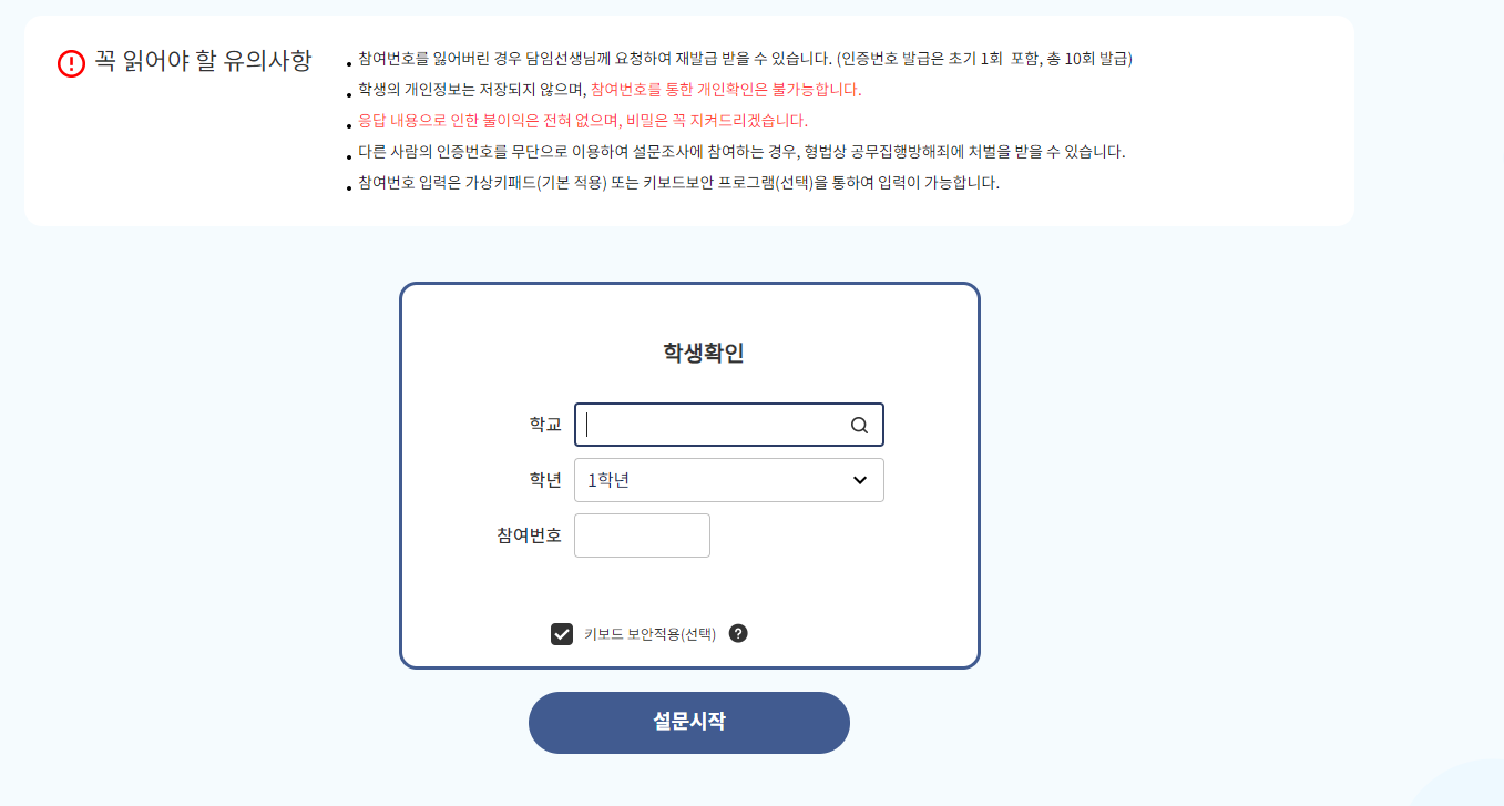 - 학교명, 학년, 참여번호를 입력하고 '설문시작' 버튼을 클릭하여 학적을 확인하고 설문조사를 시작합니다.