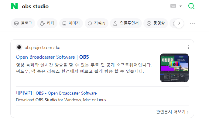 포털사이트에서 OBS studio를 검색하면 obsproject라는 URL을 사용하는 OBS studio 사이트를 볼 수 있습니다.