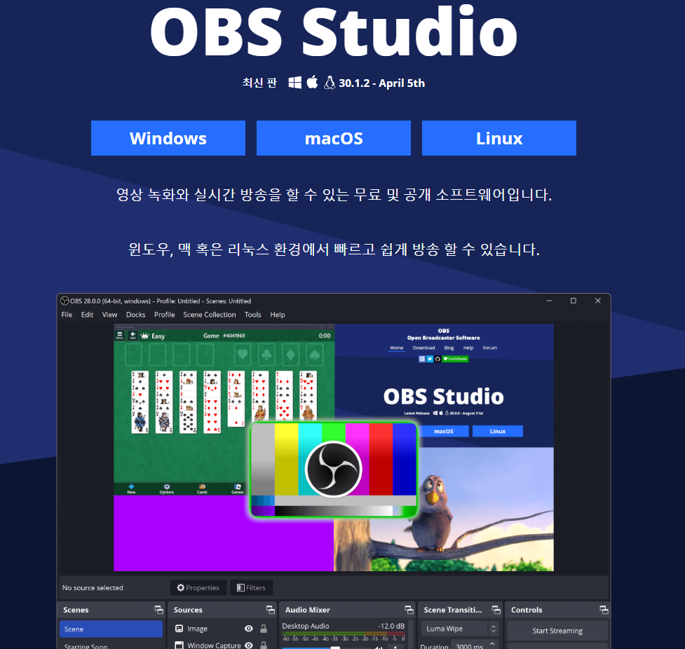 OBS studio는 오픈소스로 배포한 프로그램이라 무료입니다. 코딩을 할 수 있다면 원하는 대로 코드를 변형하여 자유롭게 사용도 가능합니다.